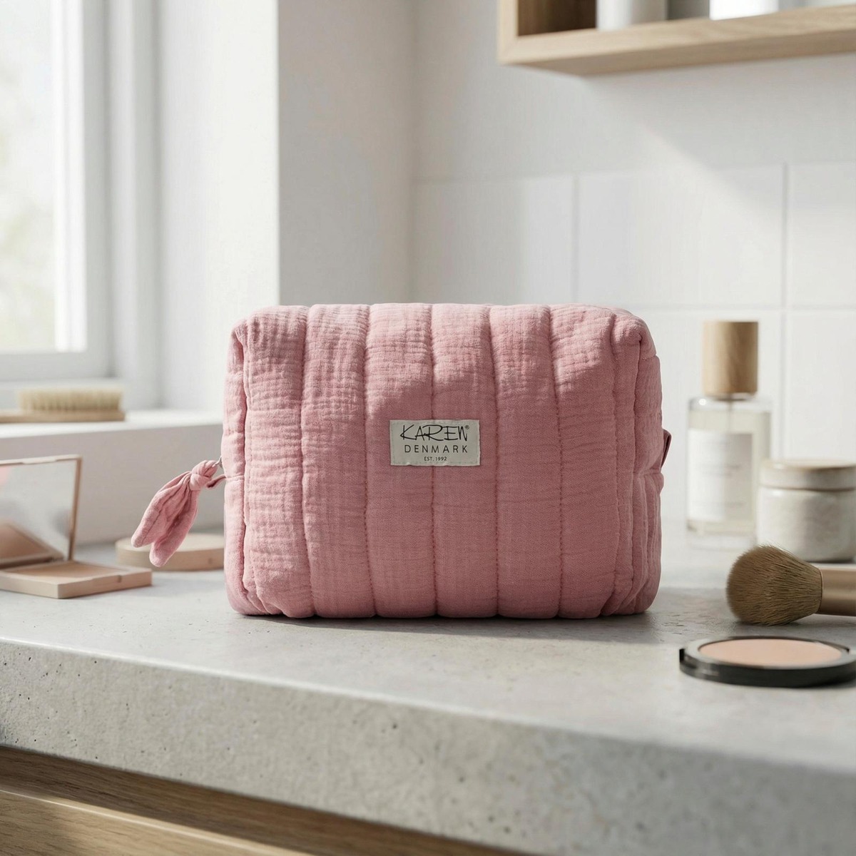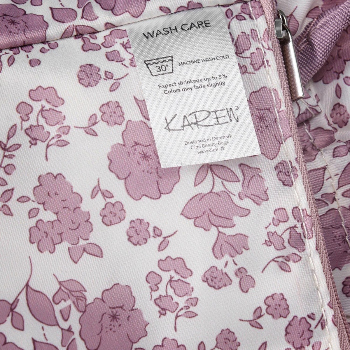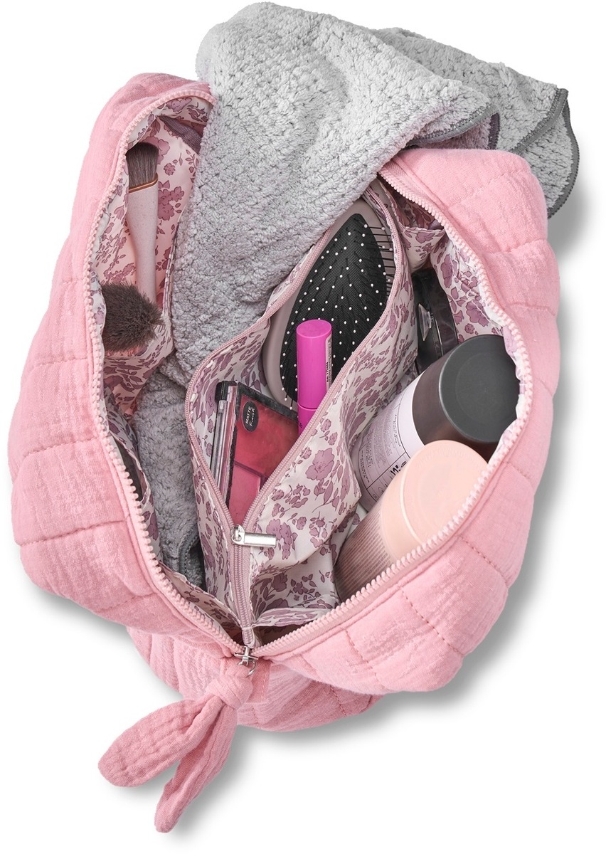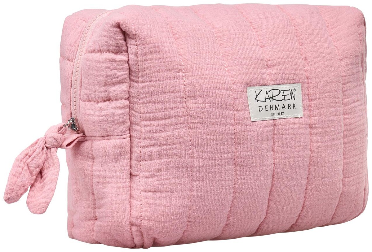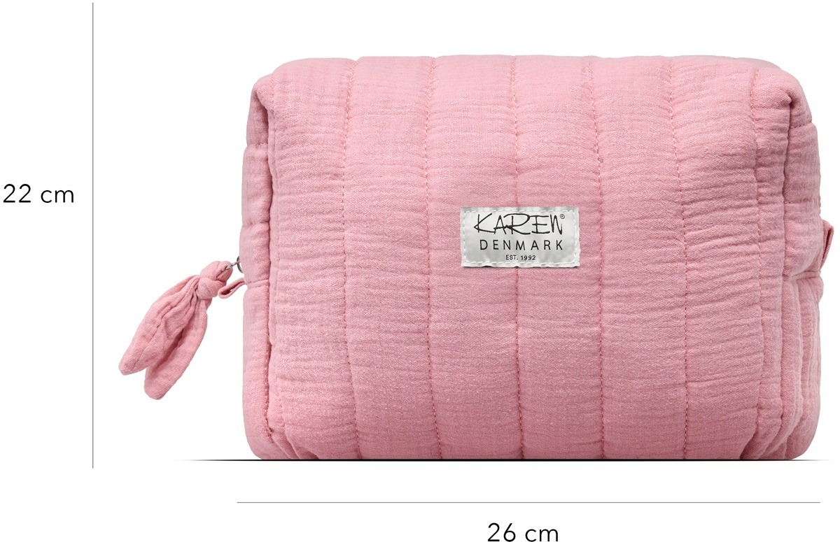 Karen-kosmetiikkalaukku on kauniista vaaleanpunaisesta tikatusta luomupuuvillasta ja tyylikäs sekä käytännöllinen. Se on valmistettu uskomattoman pehmeästä puuvillasta ja siinä on tikattu vaaleanpunainen pienikukkainen sisävuori. Se tarjoaa lisäsuojaa kalliille hoitotuotteillesi, joten voit matkustaa huoletta. Kosteuslaukku on riittävän tilava säilyttääkseen suurempia kauneustuotteita, kuten hiuslakkaa ja suoristusrautaa. Sisällä on neljä käytännöllistä taskua, jotka on lisäksi vahvistettu paneelilla, sekä suuri vetoketjullinen lokero keskellä, joka antaa sinulle runsaasti mahdollisuuksia järjestää tuotteesi. Karen-kosmetiikkalaukku on helppo avata ja sulkea suuren vetoketjullisen kahvan ansiosta, mikä takaa käyttäjäystävällisen kokemuksen. Jos laukku likaantuu, sen voi helposti pestä pesukoneessa 30 asteessa alhaisella linkouksella ja rumpukuivata alhaisella lämmöllä, joten se pysyy mukavan raikkaana. Karen-kosmetiikkalaukku - Täydellinen niille, jotka haluavat tilavan ja suojaavan säilytysratkaisun kauneustuotteilleen. Mitat: P 25 × K 22 × L 10 CM