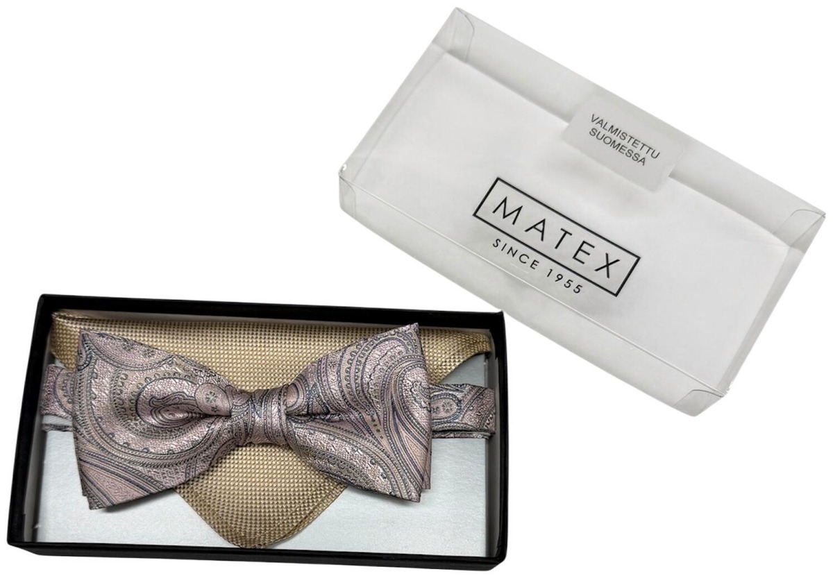 Kuosiinkudottu silkkirusetti ja kuosiinkudottu doubleface silkkitaskuliina. Tuotteet on valmistettu Suomessa.