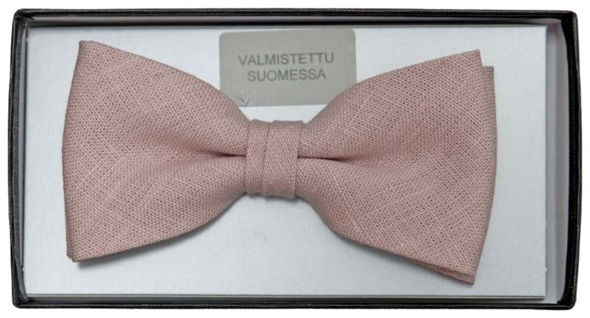 Vaaleanpunainen pellavarusetti on valmistettu Suomessa. Rusetissa säätövara niskanauhassa.