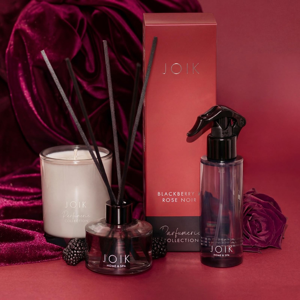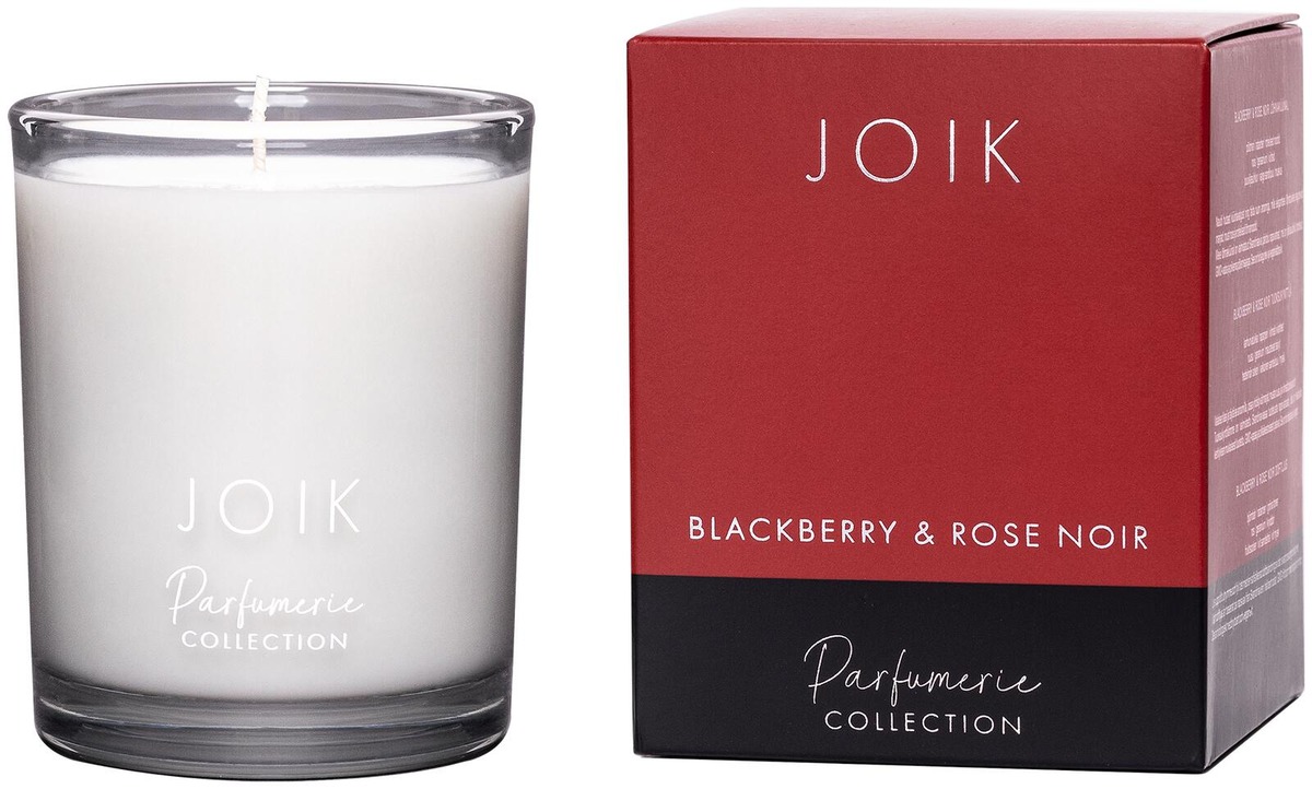 Mehevät karhunvatukat ja kirpeä raparperi avaavat tuoksun vihreän raikkaalla säväyksellä ja herättävät aistit. Sydämessä samettinen ruusu ja geranium kietoutuvat yhteen, ja hienovarainen mausteisuus tuo syvyyttä ja salaperäisyyttä. Lopuksi tuoksu jättää hedelmäisen makean vaikutelman, jota ryhdittävät valkoinen santelipuu ja myski. Mukana on häivähdyksiä tummista kukista ja villimarjoista. JOIK Home & Spa Parfumerie -kokoelman tuoksut on kehitetty tiiviissä yhteistyössä hienoimpien ranskalaisten tuoksutalojen kanssa Grassessa, Ranskassa, jota pidetään maailman hajuvesipääkaupunkina. Heidän pitkä historiansa ja yli 100 vuoden kokemuksensa, mutta samalla moderni ja innovatiivinen lähestymistapa nykytrendeihin varmistaa, että JOIK Home & Spa tuotteet valmistetaan parhaista saatavilla olevista tuoksuista. JOIK Home & SPA Tuoksukynttilä Blackberry & Rose Noir tuoksunuotit: