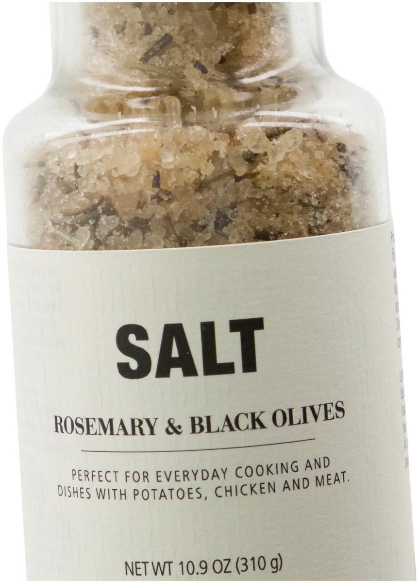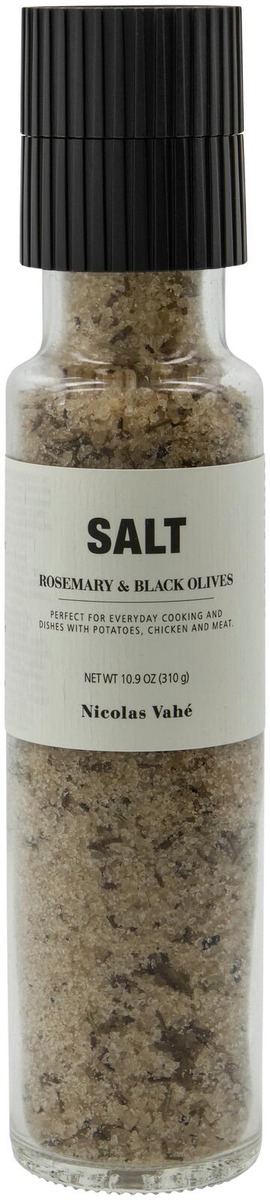 Salt med rosmarin och svarte oliven/ oliverhavssalt (klumpförebyggande medel E535), rosmarin 2%, torkad svarta oliven/oliver 1.3%, smak, vatten, matfärg: E150b.Kan innehålla spår av nötter, jordnötter, sesam, mjölk, senap och sulfitter.