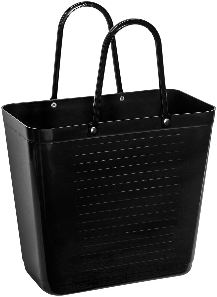 Korkea Hinza-laukku valmistetaan 100 %:sta kierrätysmuovista. Muovilaaduksi on valittu PP-muovi, sillä se on koostumukseltaan tukevaa ja jämäkkää. Näin tämä korkean mallinen laukku pitää ryhdikkäästi muotonsa myös mm. säilytys- tai kierrätysastioina käytettäessä. Laukun kahvat on valmistettu 100 %:sti sokeriruo'osta valmistetusta biomuovista, ja ruostumattomat niitit ovat nikkelöityä messinkiä. Laukun voi puhdistaa kostealla liinalla ja miedolla pesuaineella. Kestävyys, maksimipaino 14 kg, tilavuus 14 litraa.