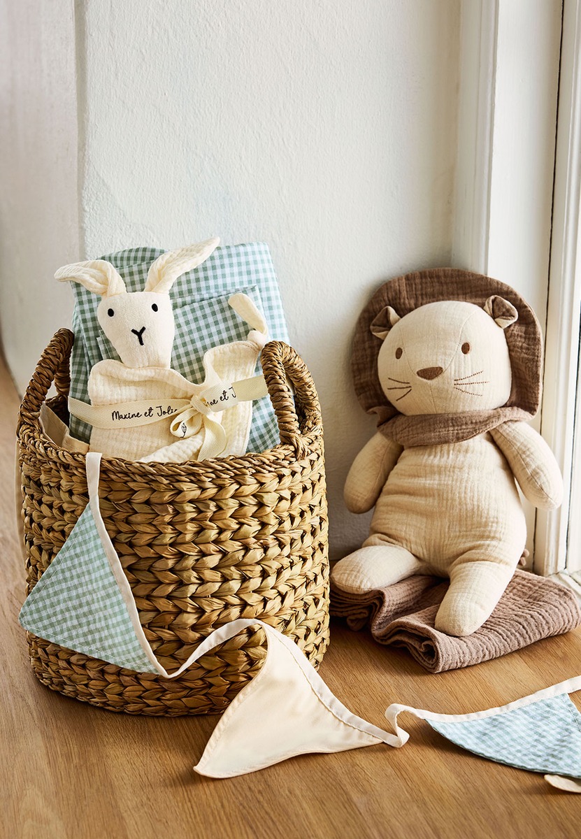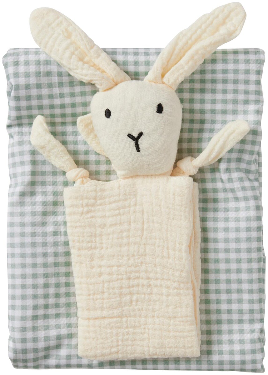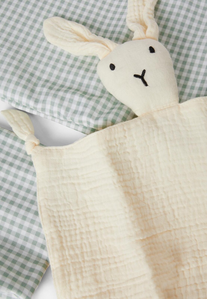 Lahjasetti vastasyntyneelle. INÉS-lahjasetti sisältää ruudullisen pinnasängyn vuodevaatesetin sekä puuvillamusliinisen uniriepun. Unirievussa on kiinnitetty pehmolelu. • Lahjasetti: vuodevaatesetti + uniriepu • Uniriepu puuvillamusliinia • Täydellinen ristiäis- tai vauvalahja Mitat: Pussilakana 110×125 cm, Tyynyliina 55×35 cm, Uniriepu 25×27 cm Poista nauhat ja kaikki pakkauksen osat ennen kuin tuote annetaan lapselle.