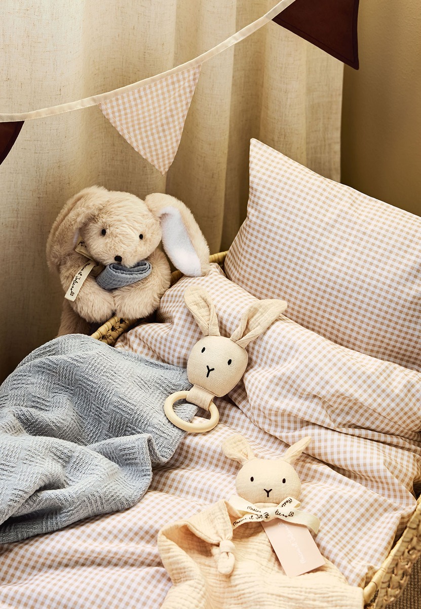 Lahjasetti vastasyntyneelle. INÉS-lahjasetti sisältää ruudullisen pinnasängyn vuodevaatesetin sekä puuvillamusliinisen uniriepun. Unirievussa on kiinnitetty pehmolelu. • Lahjasetti: vuodevaatesetti + uniriepu • Uniriepu puuvillamusliinia • Täydellinen ristiäis- tai vauvalahja Mitat: Pussilakana 110×125 cm, Tyynyliina 55×35 cm, Uniriepu 25×27 cm Poista nauhat ja kaikki pakkauksen osat ennen kuin tuote annetaan lapselle.