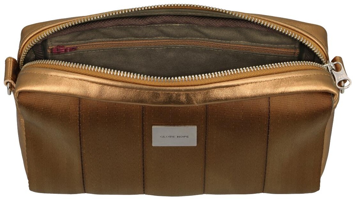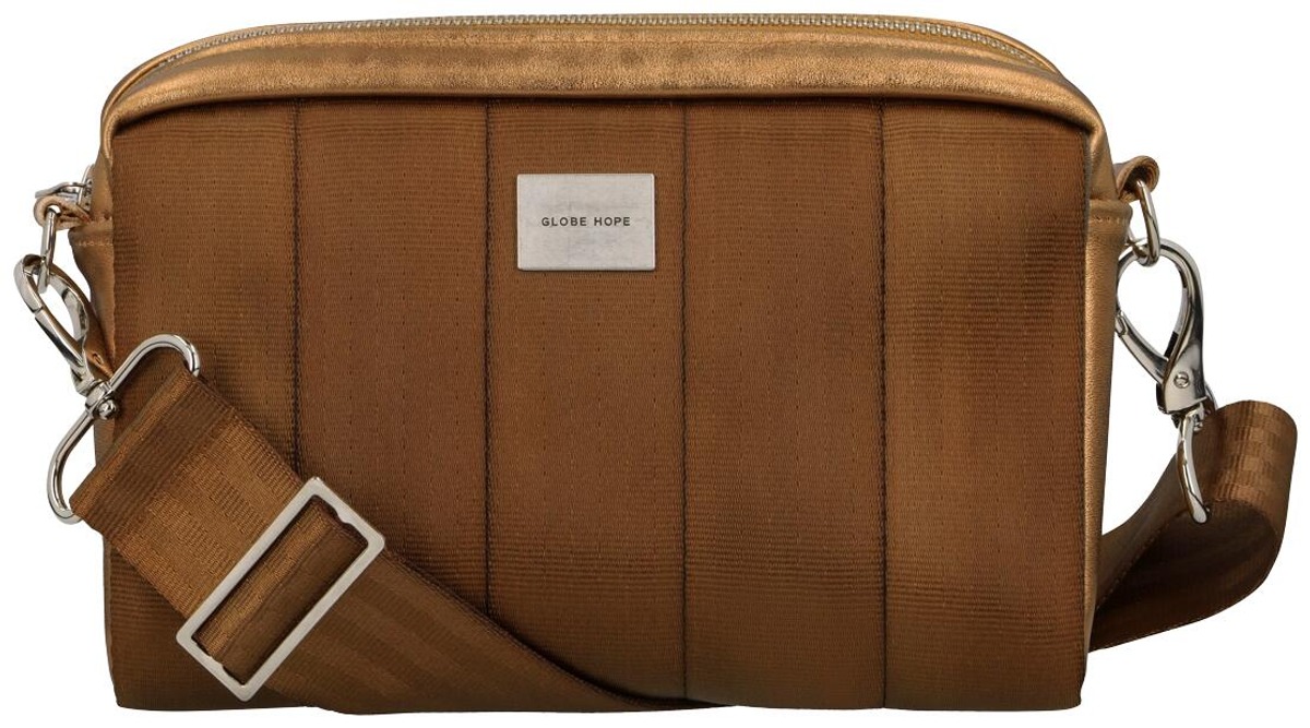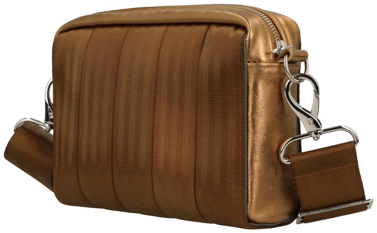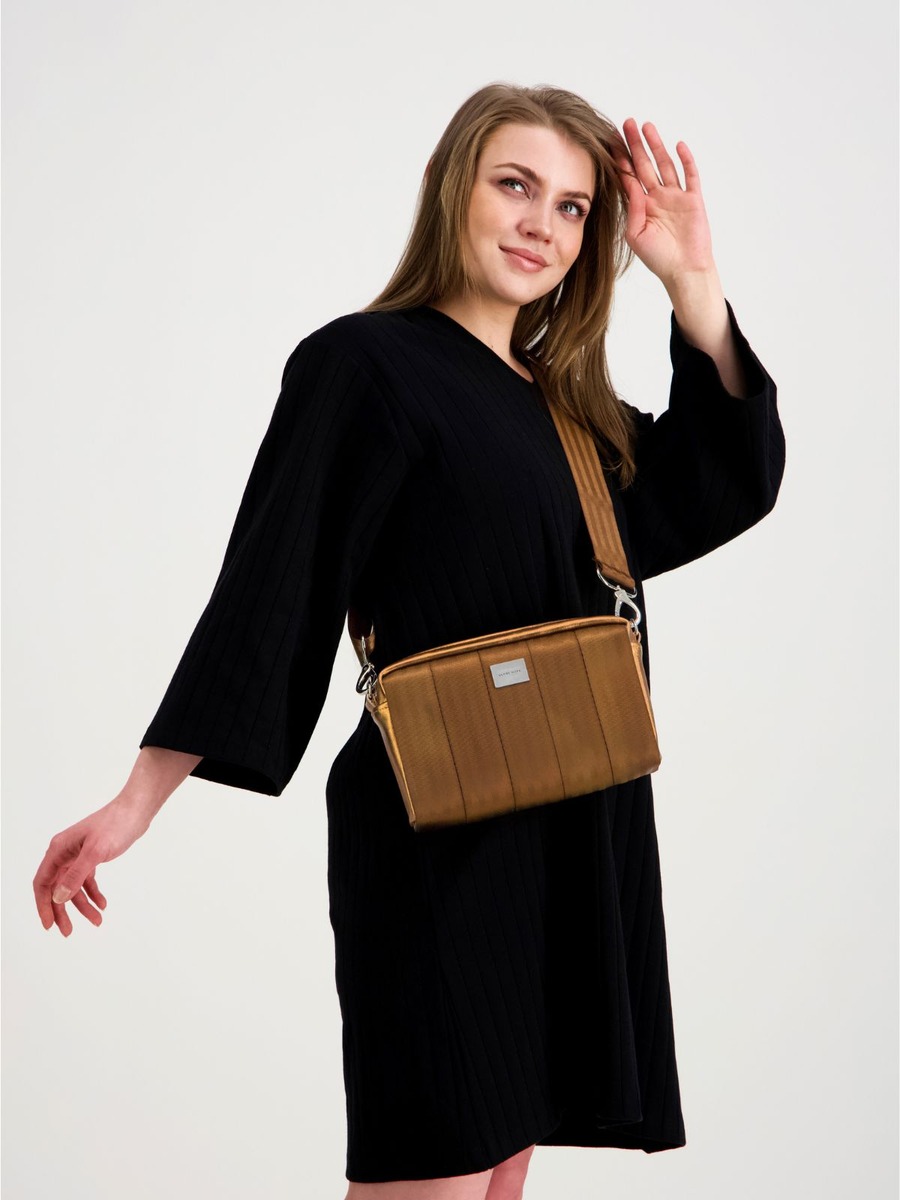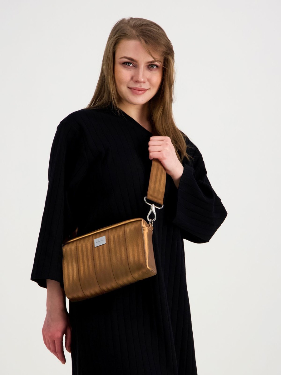 ASTE kimaltavana pronssina yhdistää lämpimän sävyn ja hienovaraisen hohteen. Nahkaosien kimaltava viimeistely tuo laukkuun elävyyttä, ja pronssinsävyinen turvavyöpinta pitää kokonaisuuden rauhallisena ja helposti yhdisteltävänä.